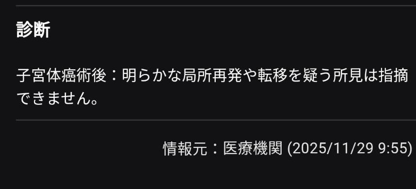 結果は、「子宮体癌術後:明らかな局所再発や転移を疑う所見は指摘できません」との診断でした。この結果に、心からホッとします。そして、これまで支えてくださった多くの方の顔が浮かびます。本当にありがとうございました。